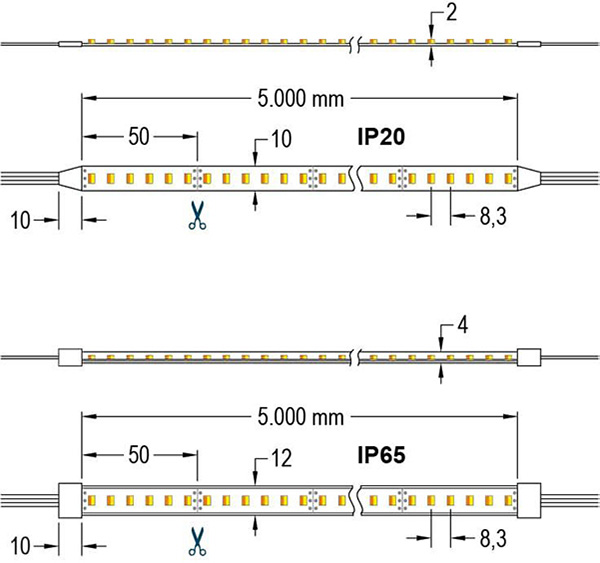 Omdat bij LED strips en lichtslangen meerdere LED's of lampen in serie zijn geschakeld, zijn deze niet op iedere gewenste lengte in te korten. Hier staat opgegeven per hoeveel mm het product kan worden ingekort. |