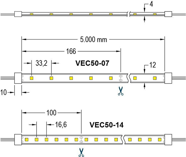 Omdat bij LED strips en lichtslangen meerdere LED's of lampen in serie zijn geschakeld, zijn deze niet op iedere gewenste lengte in te korten. Hier staat opgegeven per hoeveel mm het product kan worden ingekort. |